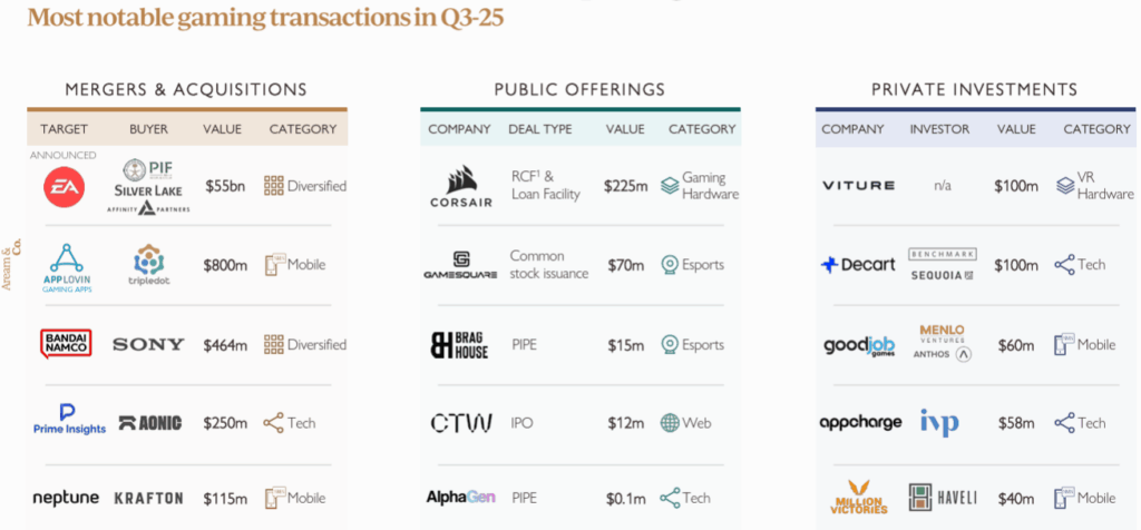 Aream & Co., the largest independent investment bank focused exclusively on interactive entertainment and working with Founders, CEOs, and Boards, has shared its Q3 2025 report on the games industry.