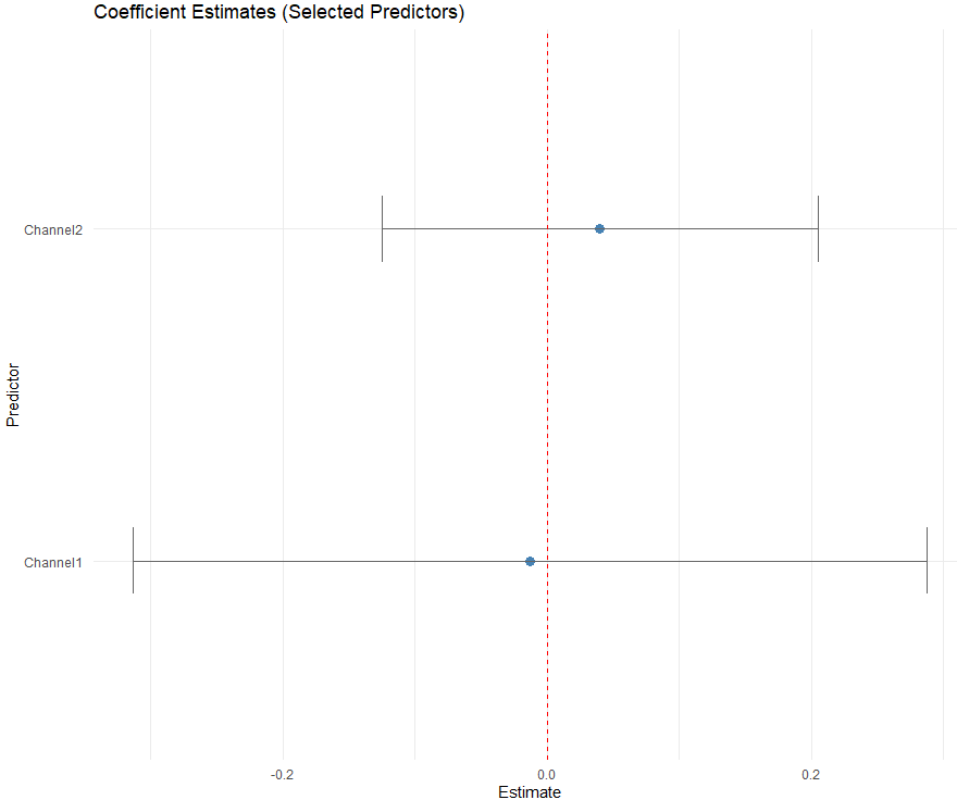 Analysis of the linear regression model indicates that Channel 1 has a negative coefficient, while Channel 2 has a positive coefficient; however, neither is statistically significant. Examination of historical data suggests that Channel 1 may exhibit fluctuating or inconsistent effects across different periods or datasets, which likely contributes to its lack of significance compared to Channel 2.