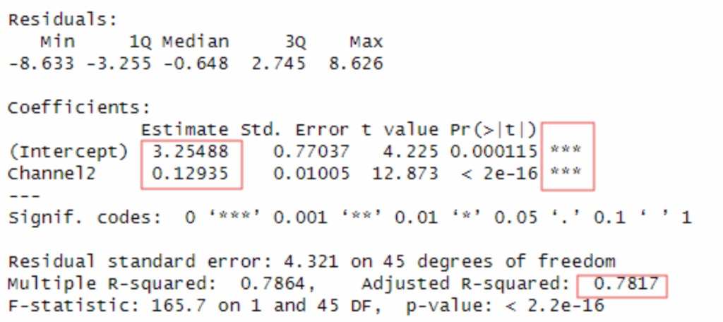 - Channel2 has a highly significant positive effect (Estimate = +0.13, p < 0.001), indicating that increases in this channel are strongly correlated with higher organic installs.