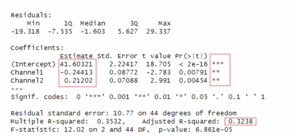 The model explains about 35% of the variance (R² = 0.35, Adj. R² = 0.32), with an overall F-test confirming statistical significance (p < 0.001). Overall, these results show that organic traffic in Market 1 is meaningfully influenced by activity in both channels, though in opposite directions.