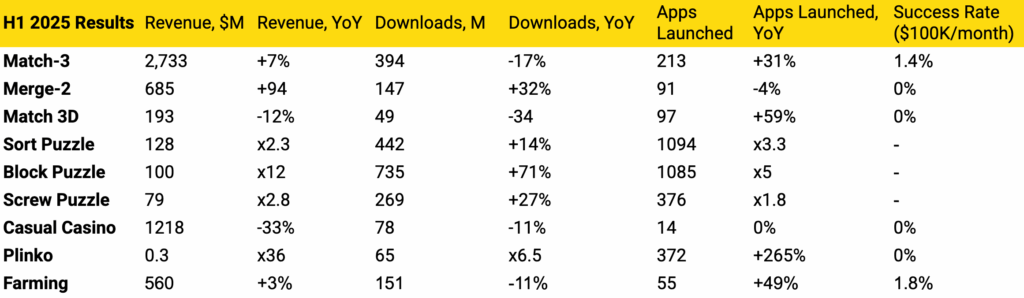 Not all genres have sustained their early momentum. Match 3D—once a rising star—has reached its ceiling and settled into revenue levels far below the top casual tier.