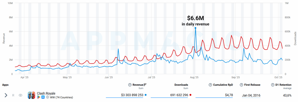 September 2025 marked a new daily revenue peak for Clash Royale, and the game generated $6.6M in a single day, surpassing its previous record of $4.9M in daily revenue set right after its global launch.