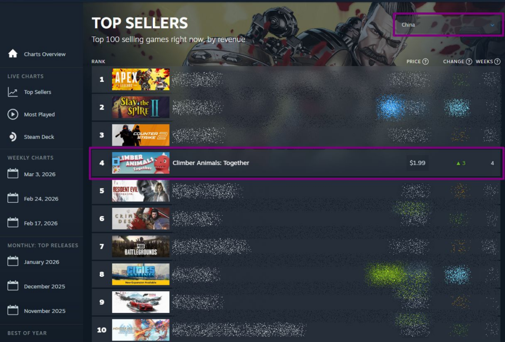 At its peak during this period, Climber Animals: Together reached the Top 5 on China’s Top Sellers list. This visibility has transformed the project from a localized success into a competitive international product.