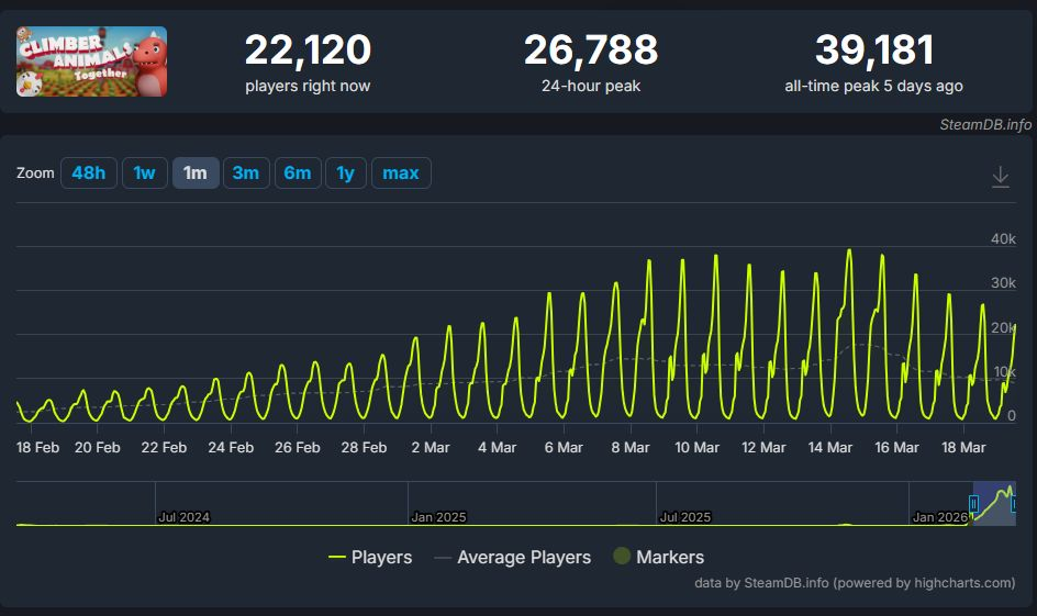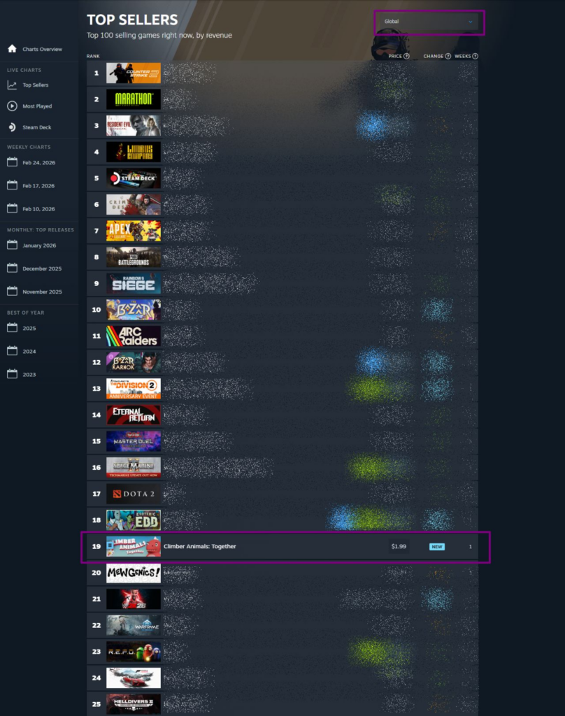 Developed and published by Devotion Interactive, Climber Animals: Together reached a 40,000-player peak and secured a Top 20 position on Steam’s Global Top Sellers, marking a significant commercial turnaround for the 2024 release.