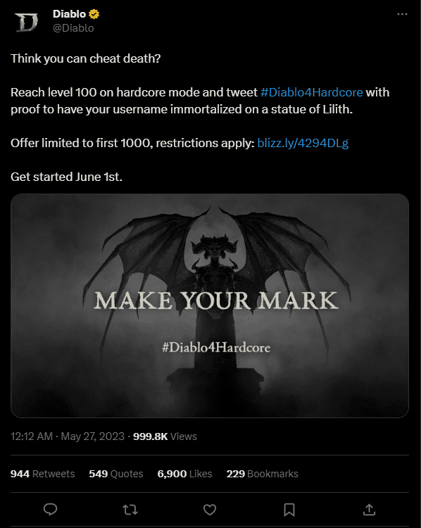 Diablo IV, Blizzard’s upcoming legendary hack n slash game, has announced a new contest on its social media. Players who can manage to level up to 100 on hardcore mode can enter the contest and get their names inscribed on a statue of Lilith.