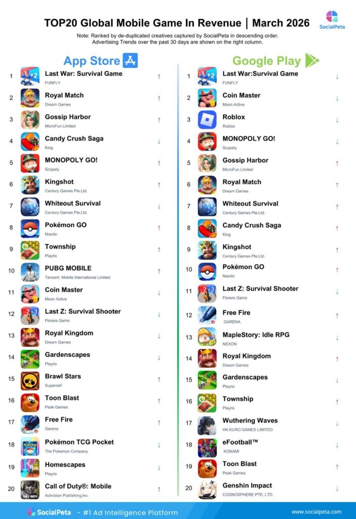 • Last War: Survival: The undisputed “King of Revenue” held its No.1 spot on the charts. Its single-platform revenue for March reached approximately $50 million, a month-on-month (MoM) decrease of 13.6%.