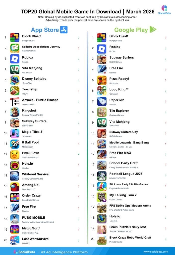 The global mobile games with the maximum downloads in March 2026 reflect intensifying competition driven by large-scale user acquisition, cross-platform revenue shifts, and diversified monetization strategies.