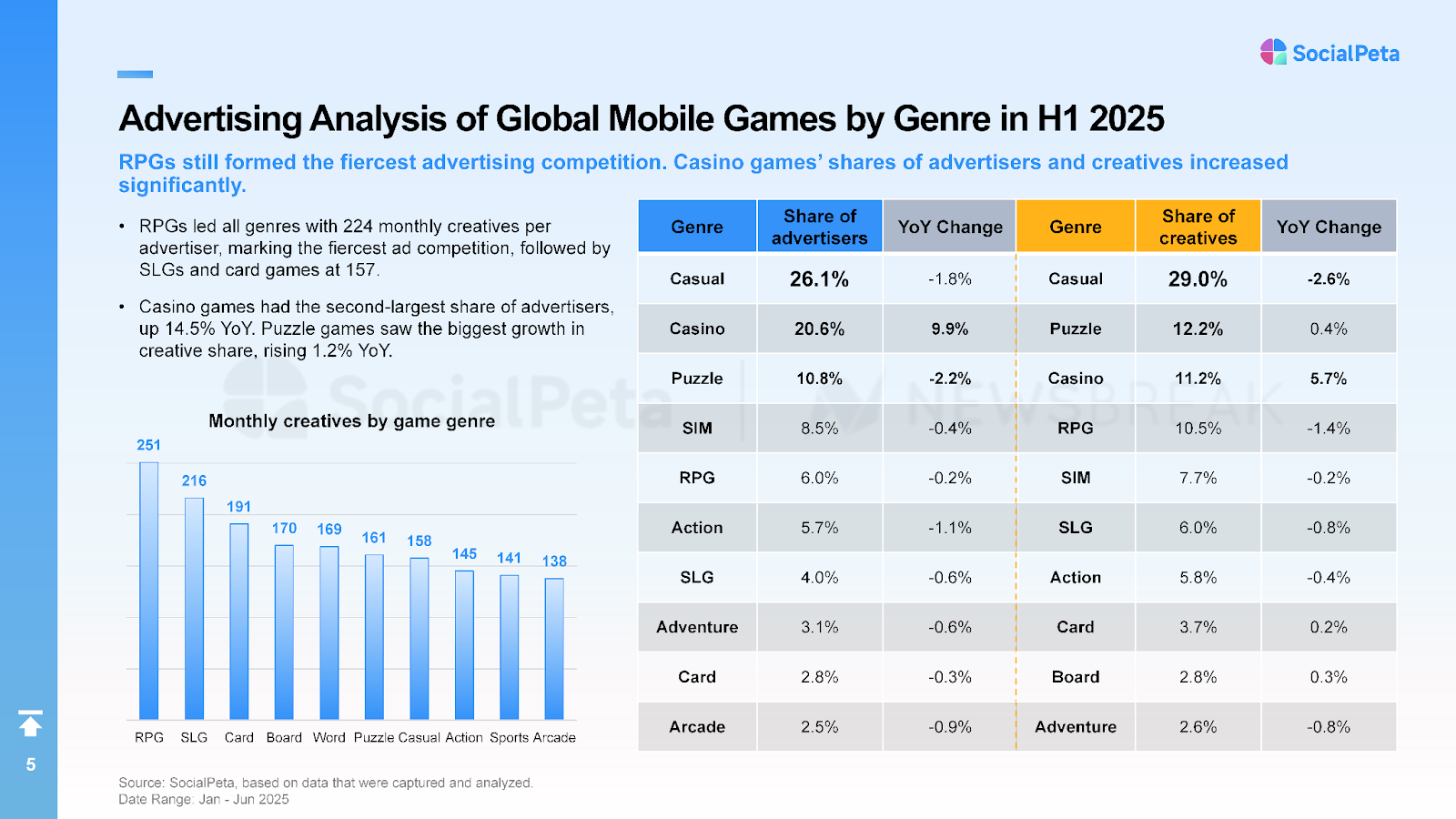 According to H1 2025 data on top-performing mobile game genres, RPGs remained the most competitive, averaging 251 creatives per month, the highest among all categories, followed closely by strategy games with 216 creatives.