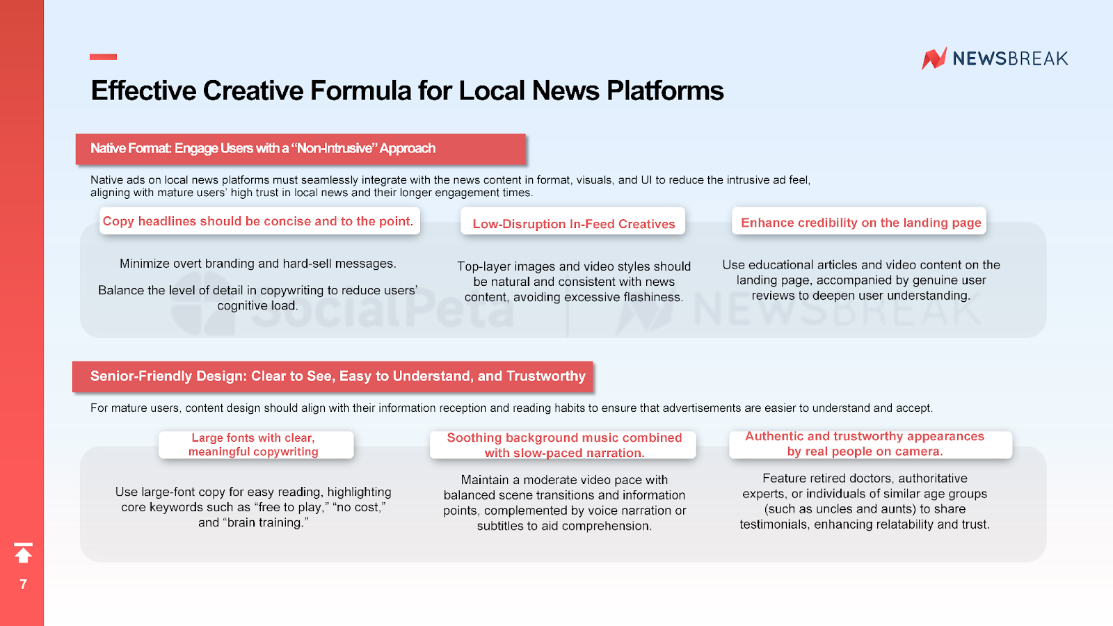 Local news platforms followed well-defined strategies for creative production. Native ad formats focused on a non-intrusive, seamless experience, featuring concise, soft-sell headlines and a natural visual style that blended effortlessly with editorial content. Landing pages leveraged educational material and user reviews to enhance credibility and drive conversions.