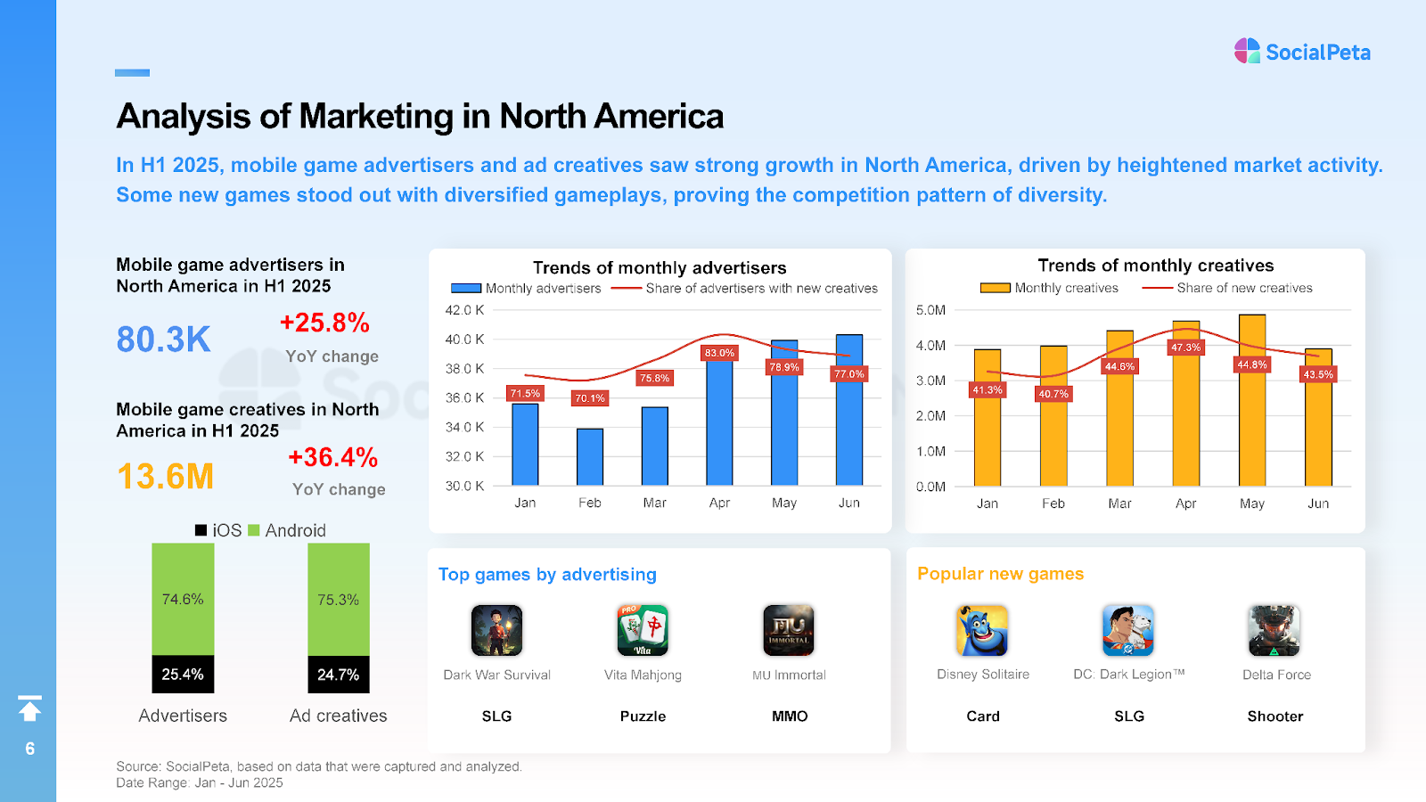 In H1 2025, the North American mobile game market saw significant expansion. Advertiser numbers climbed to 80.3K, reflecting a 25.8% year-over-year increase, while total creative volume soared to 13.6 million, up 36.4% YoY. The influx of new titles with unique gameplay mechanics further heightened competition across genres.