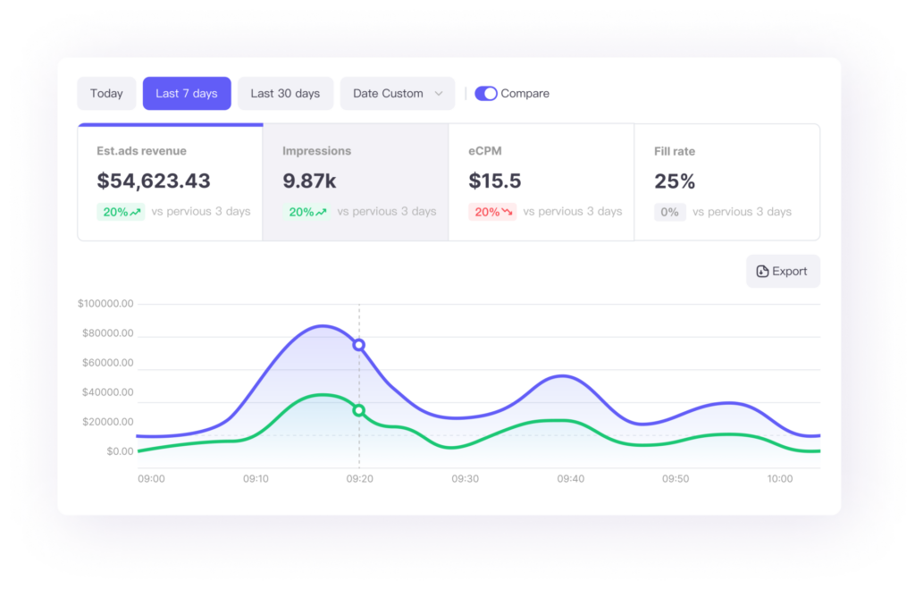 Seamlessly connect third-party mediations, in-house mediations and owned ad sources. With equal-weight management and flexible traffic allocation & bidding comparison, you can manage all traffic in one place and maximize revenue potential.