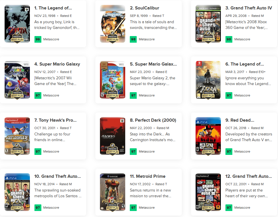 Our target audience, however, focuses on geeks and hardcore gamers. To understand their preferences, you can look at the Metacritic top 100 games of all time across platforms. These titles show the types of content, themes, and settings that resonate most with this audience.