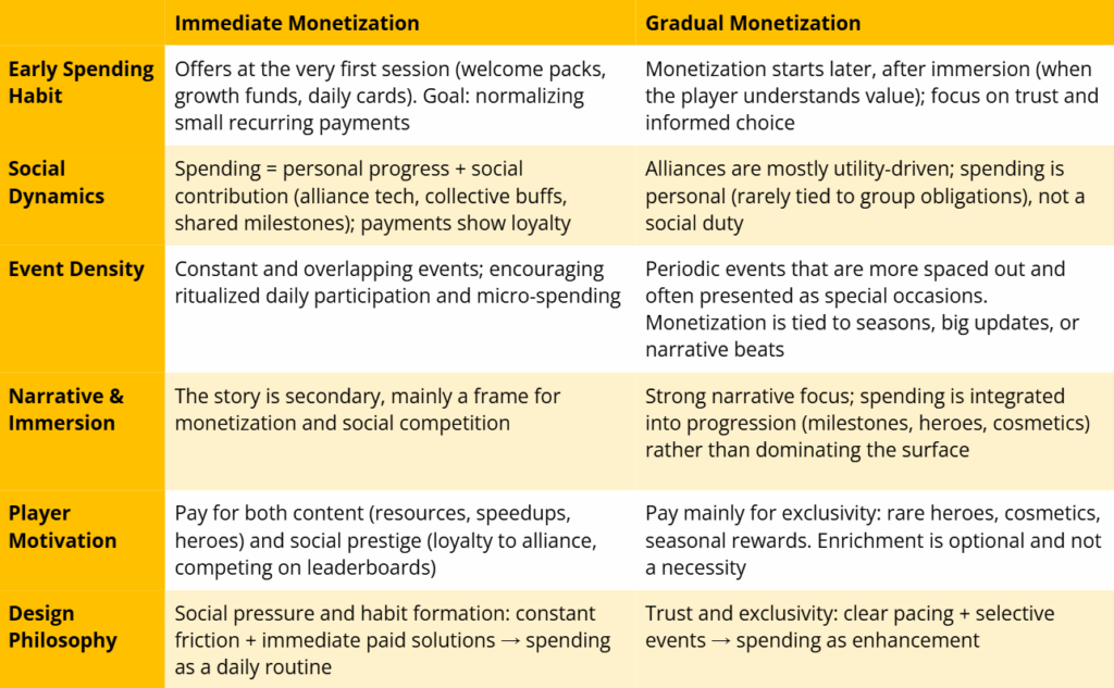 - Many 4X titles apply the immediate monetization strategy by leaning on intensity: layered offers, overlapping events, and constant friction balanced with immediate paid solutions.