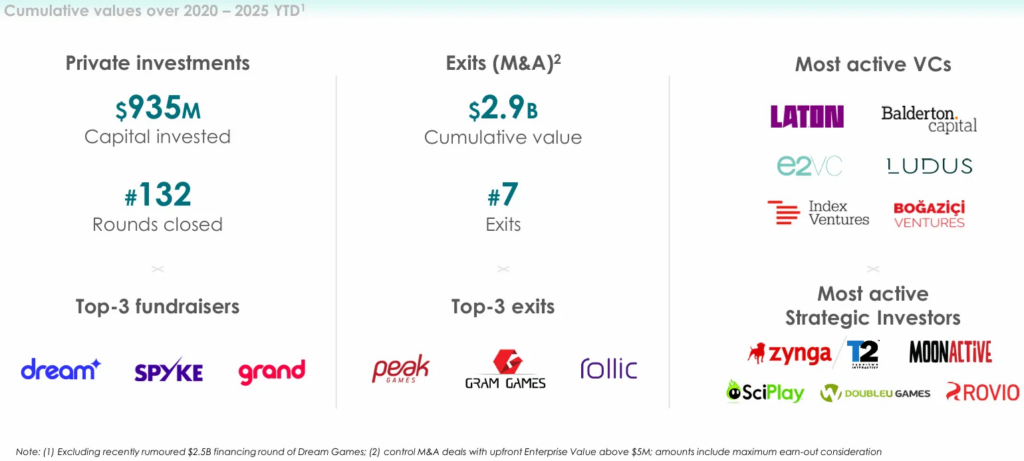 According to InvestGame report, over the past five years Turkish mobile studios have raised more than $935 million across 132+ investment rounds, while seven M&A exits have generated over $2.9 billion for founders and investors. These are strong results, and they do not yet account for a significant portion of deals that took place in 2025 after the report was published.