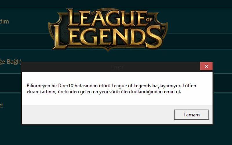 LoL DirectX hatası bazen oyun içerisinde bazen oyuna giriş ekranında bazen de oyuna “Yeniden bağlan” dedikten sonra karşımıza çıkabiliyor. Bu hata ile karşılaştığımız zaman ekranımıza “Error Bilinmeyen bir DirectX hatasından ötürü League of Legends başlayamıyor. Lütfen ekran kartının, üreticiden gelen en yeni sürücülerini kullandığından emin ol” yazısı geliyor.