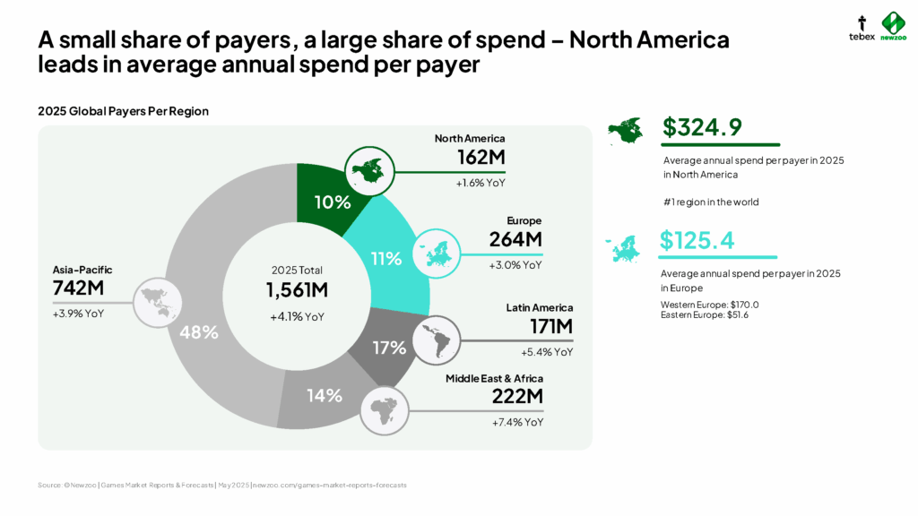In a maturing Western games market with slowing payer growth (North America: +1.1% CAGR, Europe: +3.1% CAGR, 2023-2027), studios must shift from acquiring new players to maximizing value from existing ones.