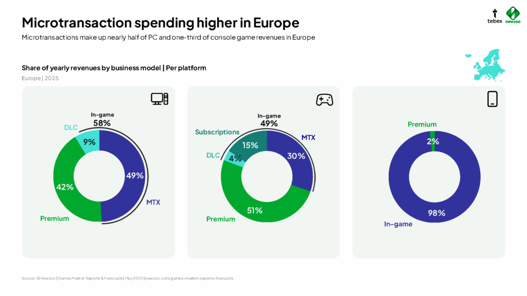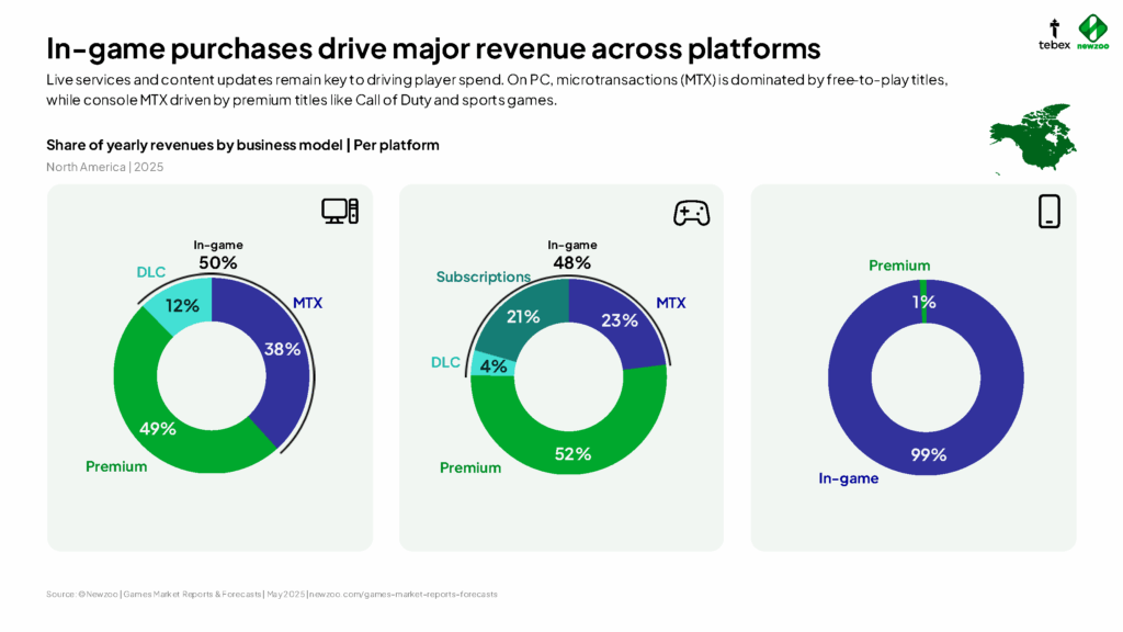 - Microtransactions (MTX): Drive 49% of PC and 52% of console revenue in North America; 42% (PC) and 51% (console) in Europe. Mobile is near 100% in-game revenue.