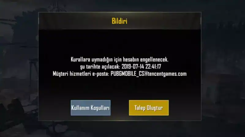 As you can see in the notification, you must send an e-mail to the customer service e-mail address to remove the ban from PUBG Mobile. Of course, you can do this by clicking the create request button. If you have skipped this screen, it will be enough to send an e-mail.