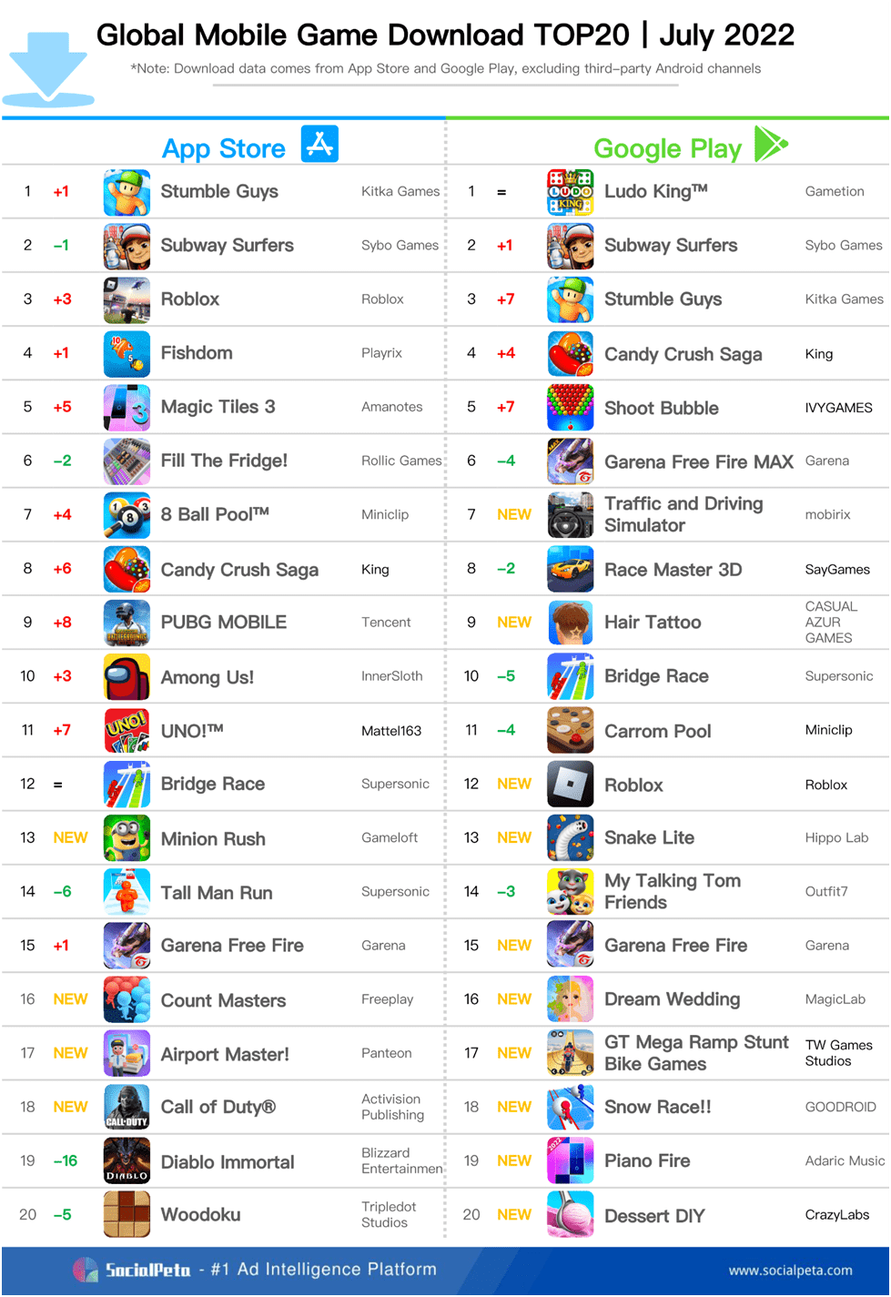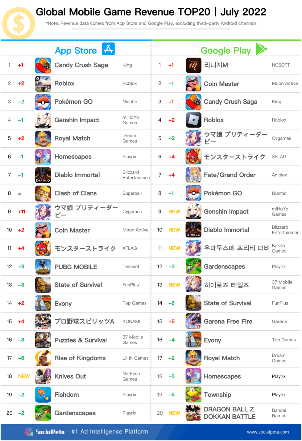 With the aid of its App Intelligence and other modules, SocialPeta sorted out the top 20 global mobile games by revenue, download, and advertising in July 2022, hoping to be of assistance to more people in the mobile app industry who try to understand the changing trends of the global mobile market.