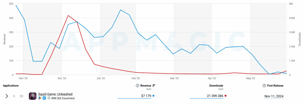 Netflix eventually released an official Squid Game mobile title in November 2024. With 20 million installs to date, the numbers are respectable, but fall short of the show’s cultural reach.