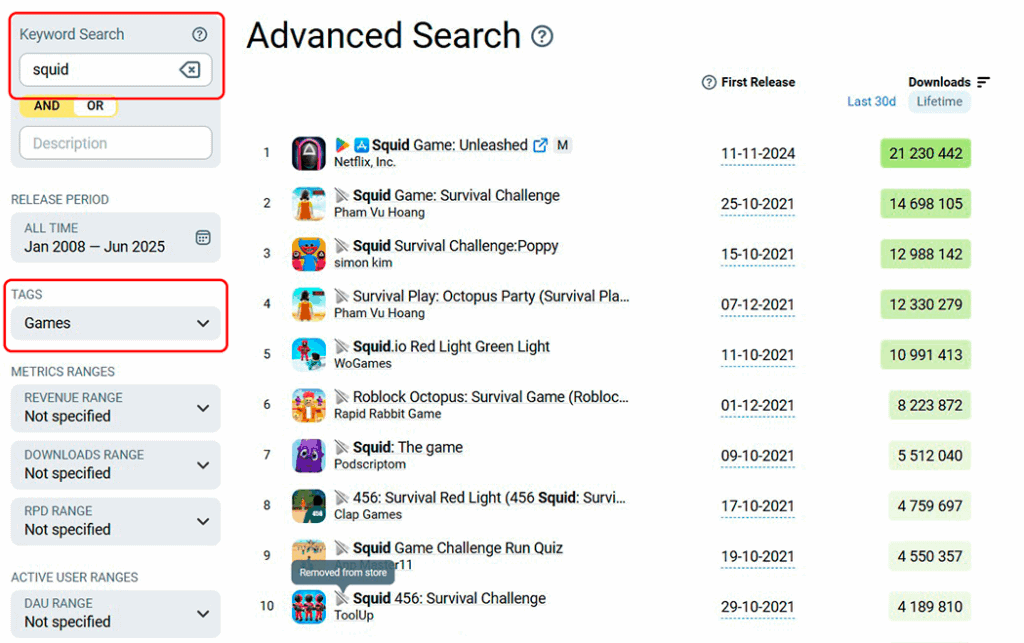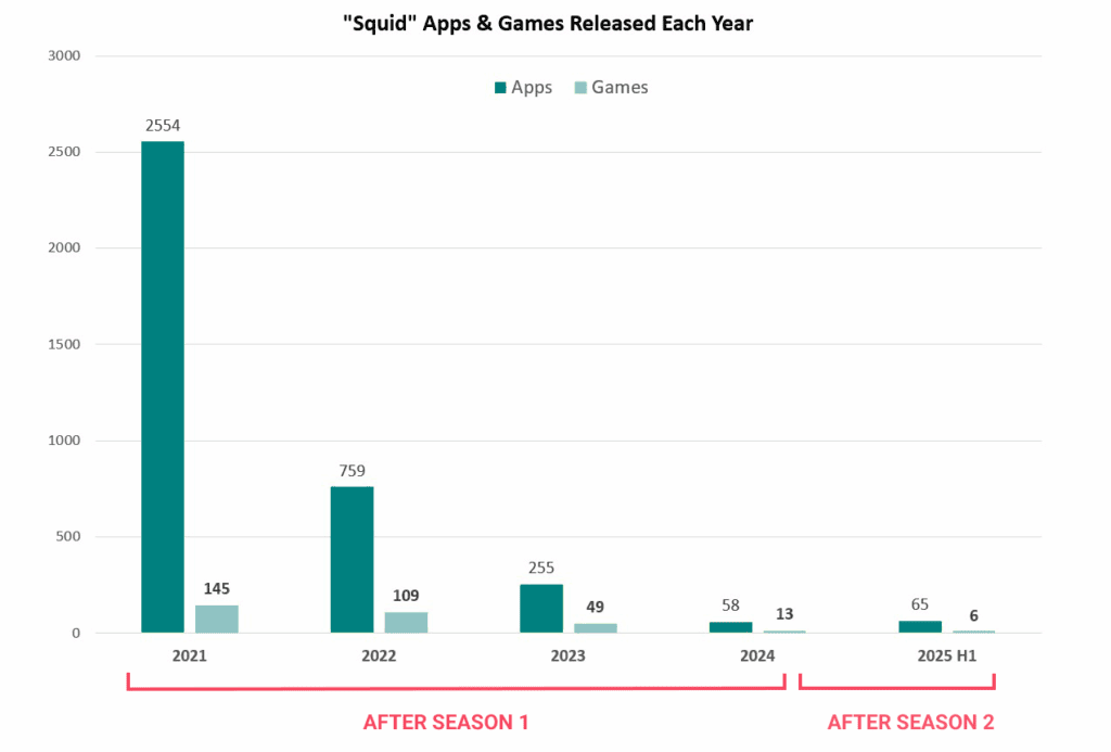 According to AppMagic data, that year alone saw 2,554 new apps using the “squid” keyword hit the stores—145 of them being games. Naturally, the momentum didn’t last forever. In 2025, with the final season airing, that number dropped to just 65 new “squid”-themed apps.