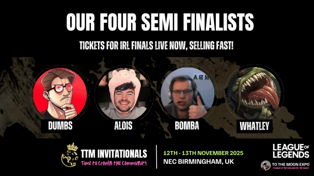 To The Moon Invitationals is a creator-driven tournament with a twist: top EUW League of Legends streamers Alois, NoArmWhatley, Dumbs, and SloppyWalrus have built teams from their viewers to compete alongside their community for a 50k prize pool in the Riot Games Licensed TTM Invitationals Tournament Finals. All protected by sponsor, Playsafe!
