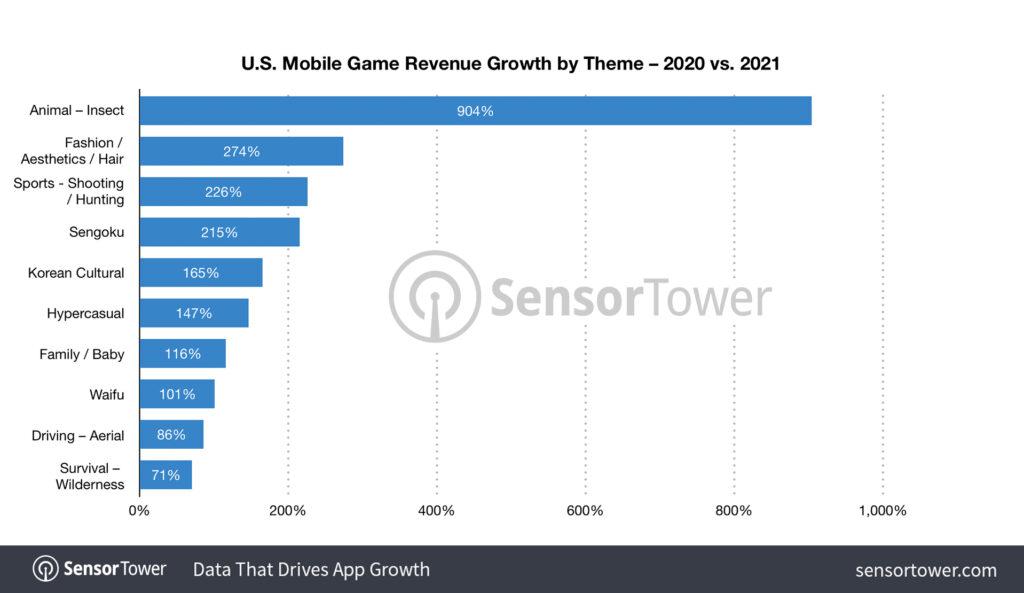 Hayvan – Böcek teması, tüm temalar arasında en hızlı gelir artışına tanık oldu ve oyuncu harcamaları 2021’de ABD’de yıldan yıla yaklaşık 10 kat artışla 26,5 milyon dolara ulaştı. Hayvan-Böcek temasının gelirine, oyuncu harcamalarının yüzde 89,6’sından yalnızca sorumlu olan ChengDu Starunion Interactive‘in The Ants: Underground Kingdom oyunu öncülük etti. Moda/Estetik/Saç teması, oyuncu harcamalarında 3,7 kat artışla 307 milyon dolar gelir elde ederek gelir bazında en hızlı büyüyen ikinci tema oldu. Spor – Atıcılık/Avcılık, yıldan yıla yaklaşık 3,3 kat artışla 18,5 milyon dolara ulaşarak bu kategoride üçüncü oldu.