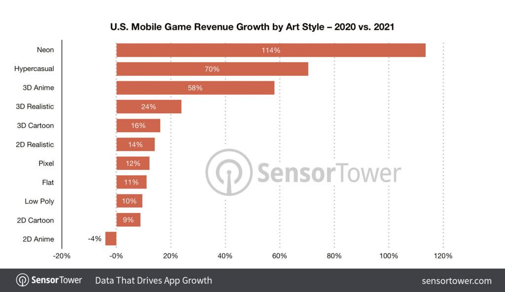 Neon, sanat stili söz konusu olduğunda yüzde 114 artışla 20 milyon dolar ile oyuncu harcamalarında en hızlı artışa sahipti. Ancak bu artış, gelirde bir artış anlamına gelmiyordu; Neon, diğer sanat stilleri arasında en az geliri sağlayan tarz oldu. Tüketici harcamalarını yüzde 70,4 artarak 46.5 milyon dolara yükselten hyper-casual sanat tarzı listenin ikinci sırasına yerleşti. 3D anime yüzde 58 artışla 906 milyon dolara çıkan tüketici harcamalarıyla listenin üçüncüsü oldu.