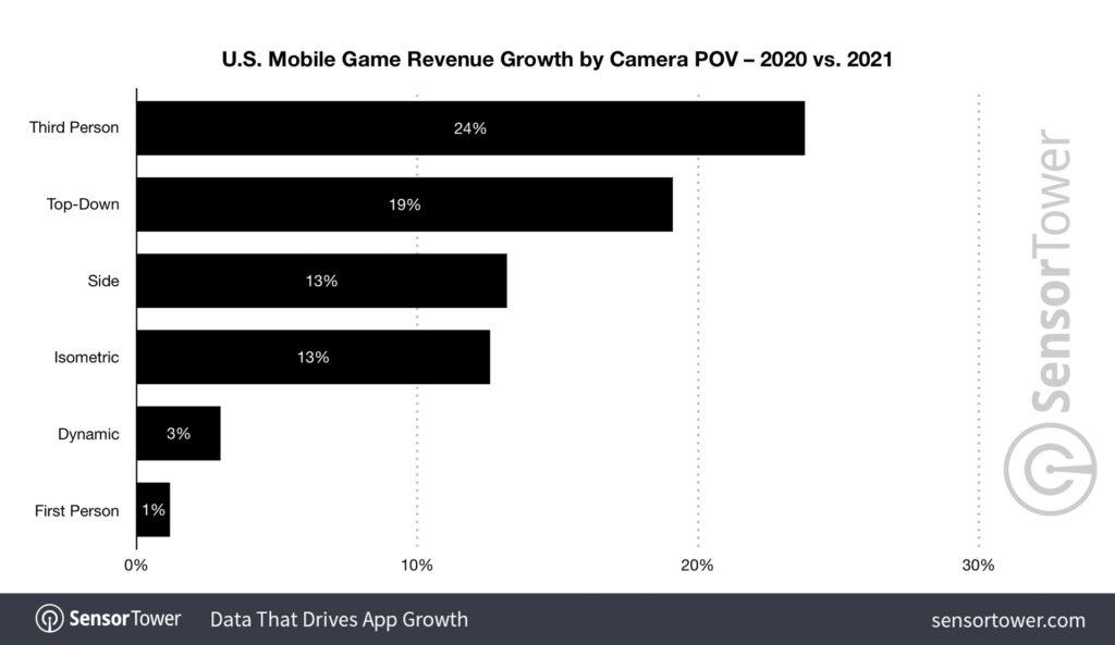 2020 ile karşılaştırıldığında, üçüncü şahıs bakış açısı oyunları, gelir artışında ilk sırada yer aldı ve müşteri harcamalarında yüzde 23,8 artışla 2,1 milyar dolara yükseltti. Yukarıdan Aşağıya ve Yandan Görünüş kamera açılı oyunlar sırasıyla, yıldan yıla kabaca yüzde 19 artışla 3.8 milyar dolara ve yüzde 13,2’den 7.2 milyar dolara çıkarak en hızlı büyüyen ikimci üçüncü kamera açılı oyunlar oldular.