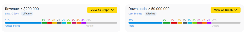 İndirmelerin; %34’ü Hindistan, %8’i Amerika, %7’si ise Brezilya üzerinden sağlanırken, uygulama içi satın alımların; %41’i Amerika, %6 İngiltere, %4 Almanya üzerinden gerçekleştirildi.