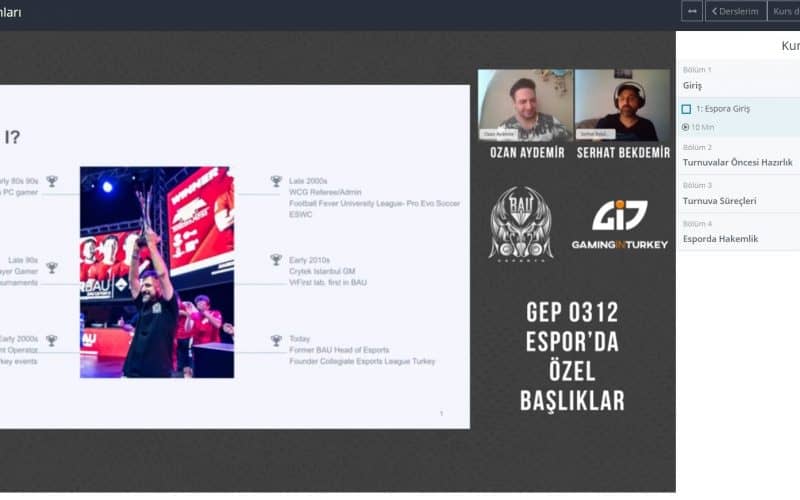 Bahçeşehir Üniversitesi her bahar döneminde açılan espor derslerini herkesin kullanımına açtı. “GEP0312 Esporda Özel Başlıklar” ismi taşıyan ders, Bahçeşehir Üniversitesi’nin online eğitim platformu open.bau.edu.tr üzerinden erişilebilir durumda.