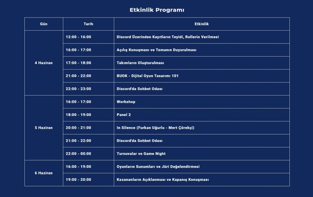 Oyun geliştirmeye ilgi duyan deneyimli, deneyimsiz herkesin katılmasını amaçlayan bu etkinliğe dilerseniz bireysel olarak katılabiliyorsunuz. Eğer bir takın arayışı içine girmek isterseniz, Boğaziçi Game Jam Discord sunucusuna vakit kaybetmeden katılmanızı öneririz. Geliştirilecek oyunların teması etkinlik günü belli olacak ve bu oyunları geliştirmeniz için herhangi bir oyun motoru, platform, tür, tarz, sanat gibi kısıtlama bulunmuyor.