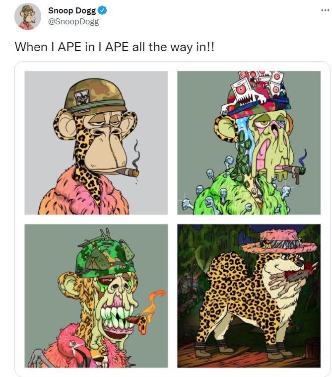 Bir diğer şarkıcı Snoop Dogg, BAYC serisindeki bütün bir “pembe kürklü Bored Ape” setine sahip. Ayrıca Snoop Dogg’un sosyal medya hesaplarından da sıkça Bored Ape’i desteklediğini görebiliyoruz.
