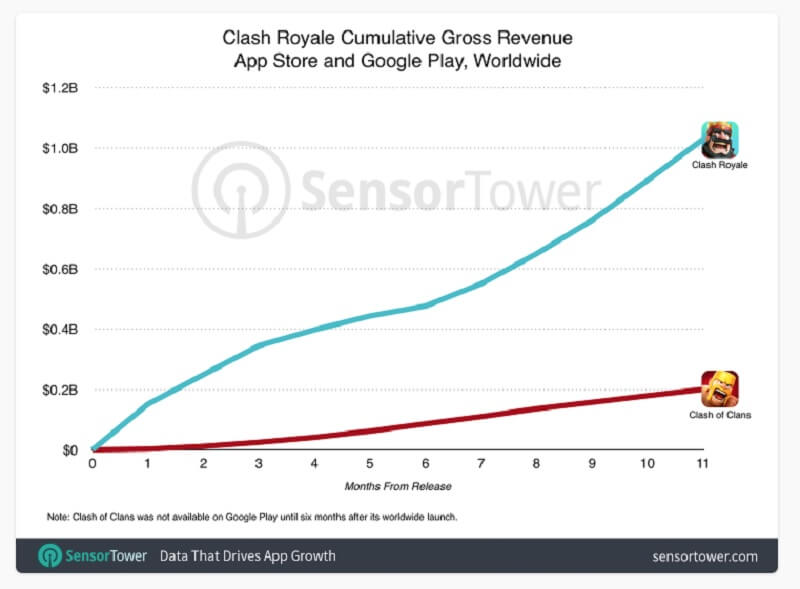 Daha önce 1 milyar dolar gelir barajını 7 ay içerisinde aşmayı başaran Pokémon Go, Clash Royale oyunuyla birlikte 2016 yılına damgasını vurmuştu. Kazancının büyük bölümünü Clash of Clans oyunundan elde eden Supercell, 2016 yılı içerisinde toplamda 2.3 milyar dolar gelir elde etmeyi de başarmıştı.
