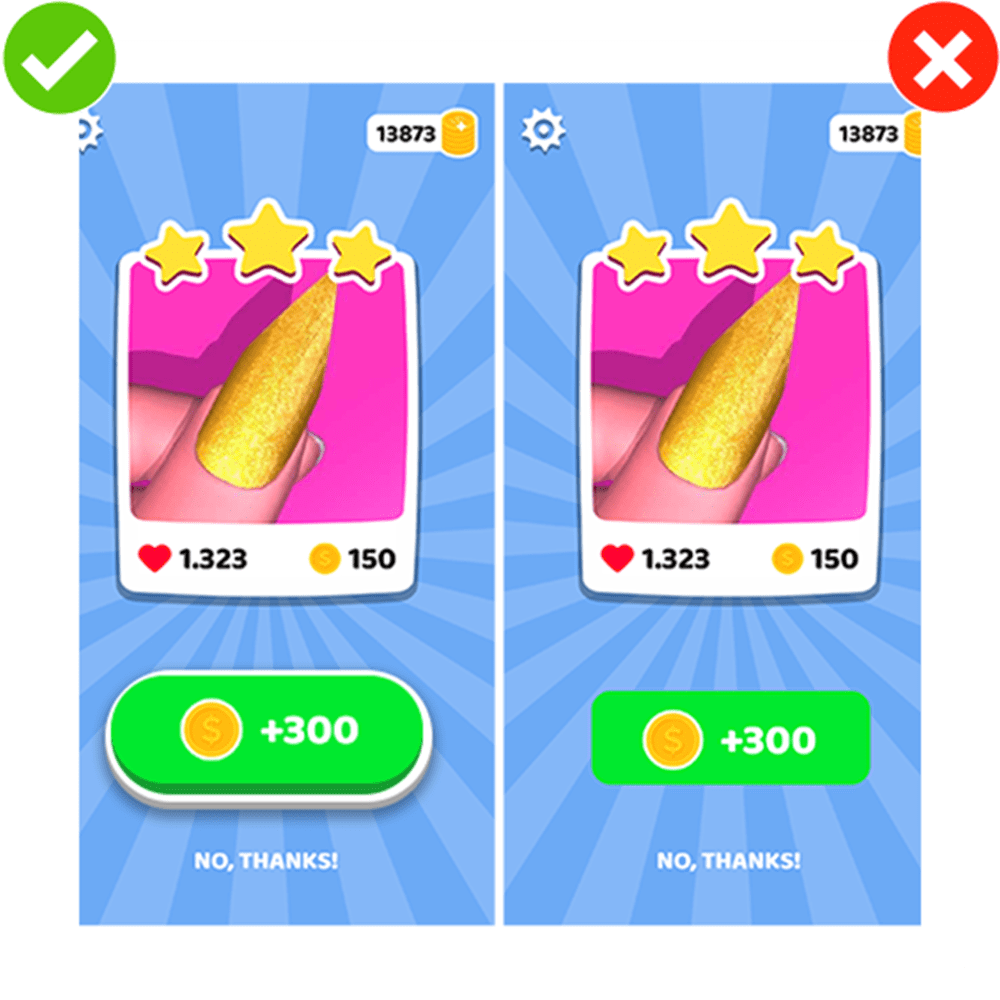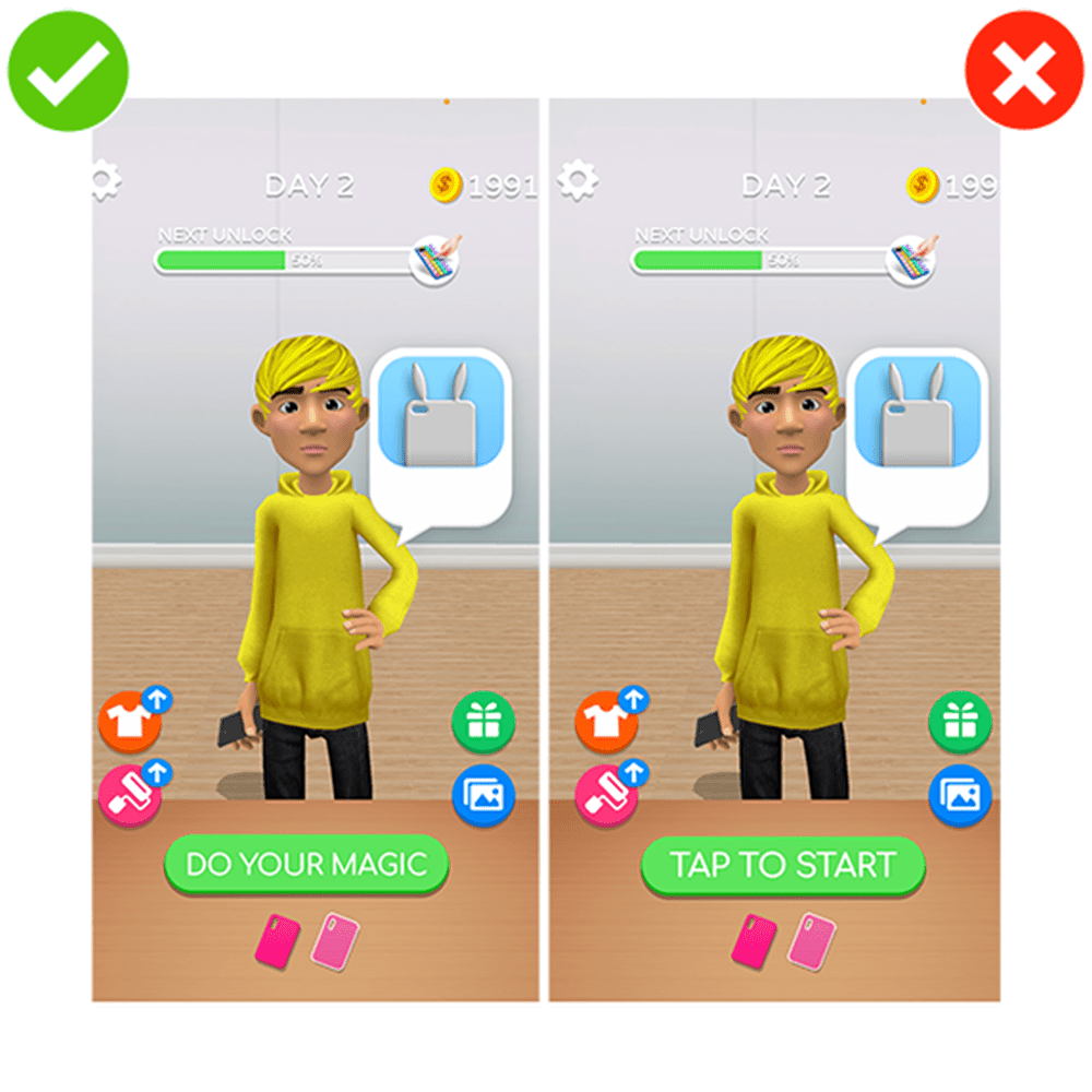 CTA butonunuza ekleyeceğiniz özel bir efekt, butonu daha tıklanabilir ve ilgi çekici yapacaktır. Bu efektin çok cafcaflı olması gerekmez, hafif bir dokunuş, bir ışıltı bile yeterli olacaktır. Küçük efektleri göz önünde bulundurmak, CTA butonlarınızın daha cazibeli ve merak uyandırıcı olması açısından büyük önem taşır. Ancak, burada dikkat etmeniz gereken bir şey var: aşırıya kaçmamak. Kullandığınız efektte aşırıya kaçarsanız, oyuncuyu rahatsız edebilir hatta oyundan uzaklaştırabilirsiniz.