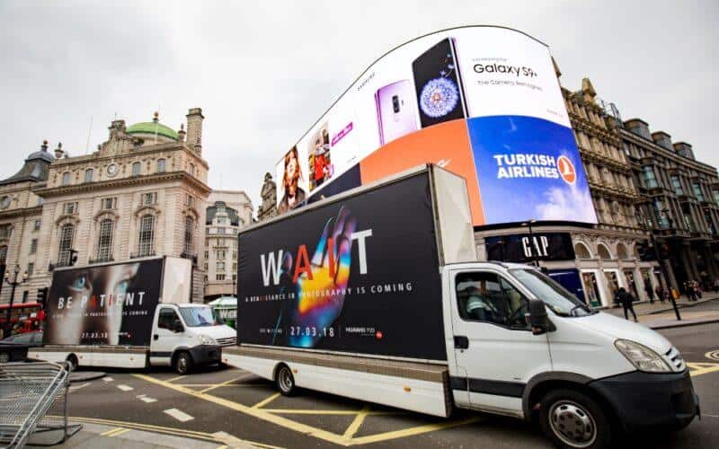 P20 serisinin piyasaya sürülmesinden bir hafta önce de olsa, Huawei tanıtım amaçlı düzenlenecek 27 Mart etkinliğine olan beklentileri ve ilgiyi arttırmak için İngiltere sokaklarına çıkmış gözüküyor. Huawei tanıtım için resimde de görebileceğiniz üzere, üzerilerinde reklamlar olan kamyonlar kullanıyor ve görünüşe bakılırsa bunu özellikle Apple ve Samsung mağazalarının önünde yapıyor. Söylenenlere göre taşıt tabanlı pazarlama, bu mağazaların dışındaki kaldırımlarda yapılan afiş ve video board reklamlarlı ile de desteklenmiş.