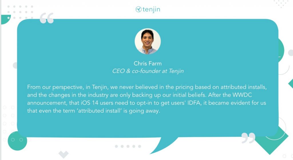 Bizim persektifimizden, Tenjin’de biz yüklemeler üzerinden fiyatlandırmaya asla inanmadık ve sektördeki değişikilikler bu inancımızı destekliyor. WWDC duyurusundan sonra, iOS 14 kullanıcılarının, kullanıcıların IDFA’sını almak için kaydolması gerektiğinden, “ilişkilendirilmiş yükleme” teriminin bile ortadan kaltığı bizim için belli oldu. – Chris Farm – CEO & Co-Founder at Tenjin