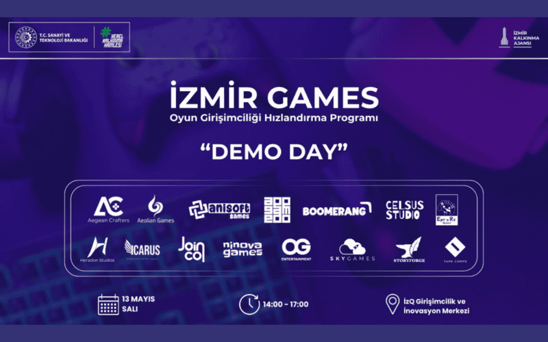 İzQ Girişimcilik ve İnovasyon Merkezi’nde saat 14:00–17:00 arasında düzenlenecek etkinlikte, 15 oyun stüdyosu projelerini yatırımcılar ve sektör profesyonelleriyle paylaşacak.