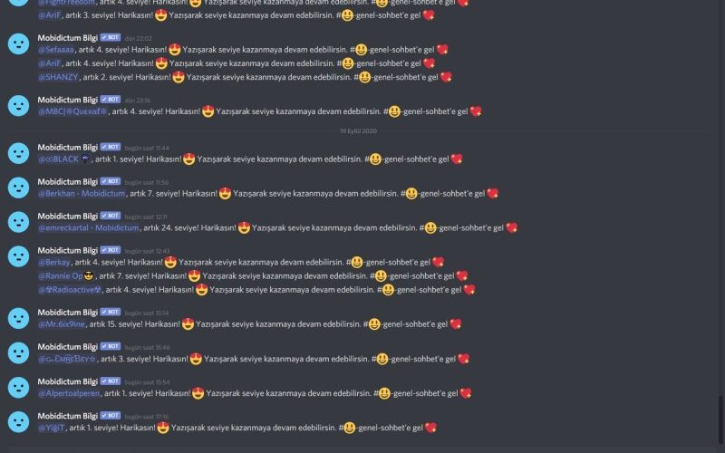 Mobidictum Discord seviye öğrenme oldukça basit. Sunucuda bulunan herhangi bir yere mesaj yazarak tecrübe kazanabileceğiniz gibi “bot-komut” kanalına “*rank” şeklinde mesaj göndererek mevcut tecrübe puanınızı ve seviyenizi öğrenebilirsiniz.
