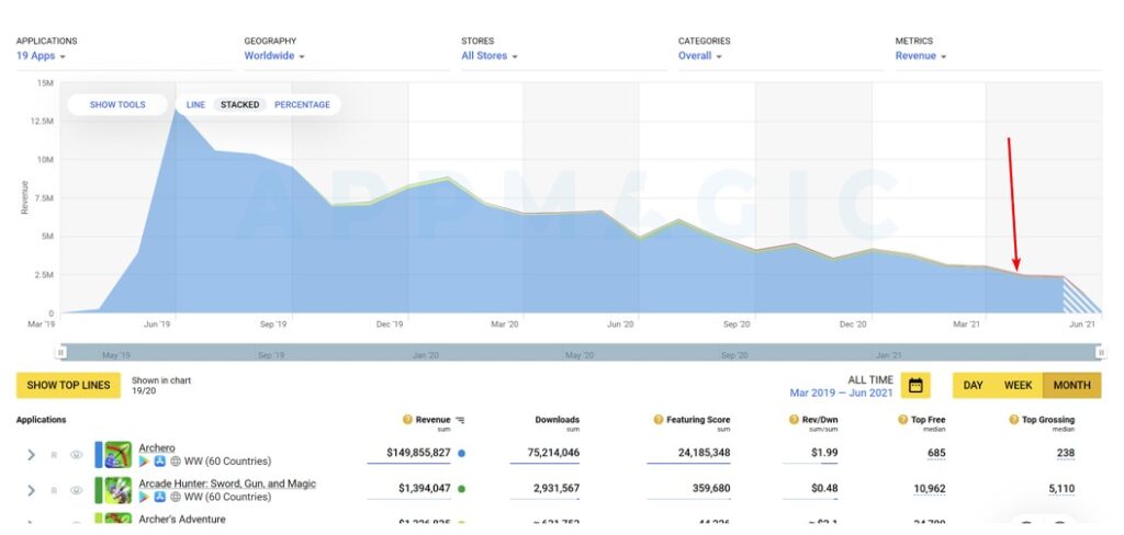 Dahası, Archero’nun geliri en başından beri düşüyor. Peki bu durum bize ne anlatıyor? Hepsinden önemlisi, bu türde bir oyun geliştirmek tehlikeli bir mücadeledir. Grafik, bize neden hiçbir Archero klonunun tam olarak başarılı olamadığını söylemiyor ama faydalanılan ve iş görmeyen fikirleri ve varyasyonları gösteriyor. Böylece sizi, başka birinin denediği ve test ettiği hatalara karşı uyarıyor ve zaman, para ve stres gibi pek çok şeyden tasarruf etmenizi sağlıyor.