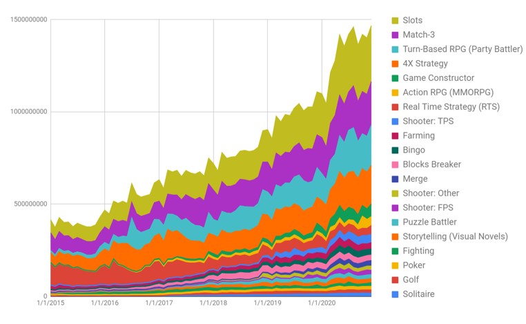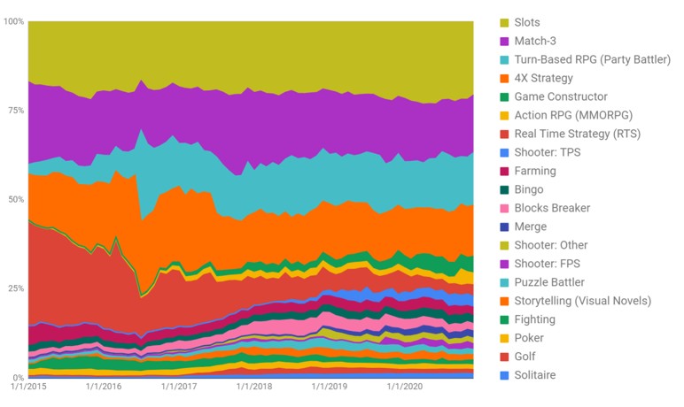 Büyük Batı ülkelerinde farklı mobil oyun türlerinin gelir paylarının nasıl değiştiğine bakarsak, ilk fark ettiğimiz şey, RTS oyunlarını temsil eden kırmızı alanda keskin bir düşüş.