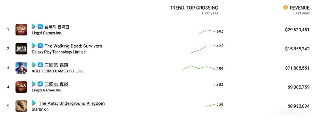 Yukarıdaki türden görselleştirmeler, AppMagic’in premium kullanıcıları tarafından kullanılabilir ve birden fazla uygulamanın gelirlerini tek bir grafikte karşılaştırabileceğiniz kullanışlı bir yoludur. Ancak yine de AppMagic’in ücretsiz araçlarını zaman içinde en çok hasılat yapan listelerde oyunların konumlarını karşılaştırmak için kullanabilirsiniz.