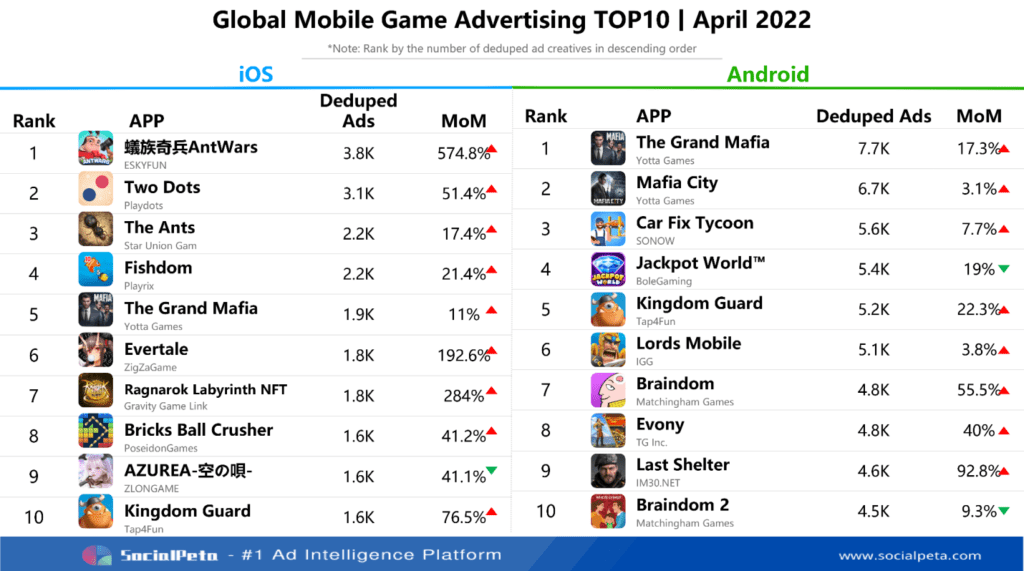 Nisan ayı reklam verilerine baktığımızda, Eskyfun tarafından yayınlanan karınca temalı SLG oyunu AntWars, iOS reklam listesinde ilk sırayı elde etmeyi başardı. Oyun, reklamlarını Çin’in Hong Kong, Makao, Tayvan bölgelerinde yoğunlaştırdı. 25 Nisan’daki resmi çıkışından bu yana Çin’in Tayvan bölgesi App Store’unda 4 gün boyunca arka arkaya ücretsiz oyunlar listesinde birinci olmayı başardı.