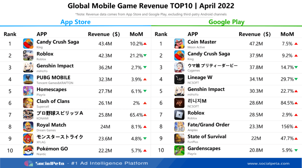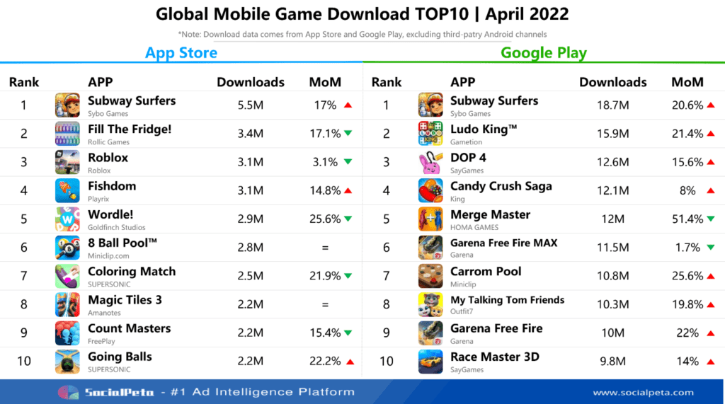 SocialPeta’nın veri analizlerine göre indirme, gelir ve reklam bakımından hem global hem de ABD’de Nisan 2022’de en iyi 10 uygulamaya girecek mobil oyunların listesini sizler için hazırladık.
