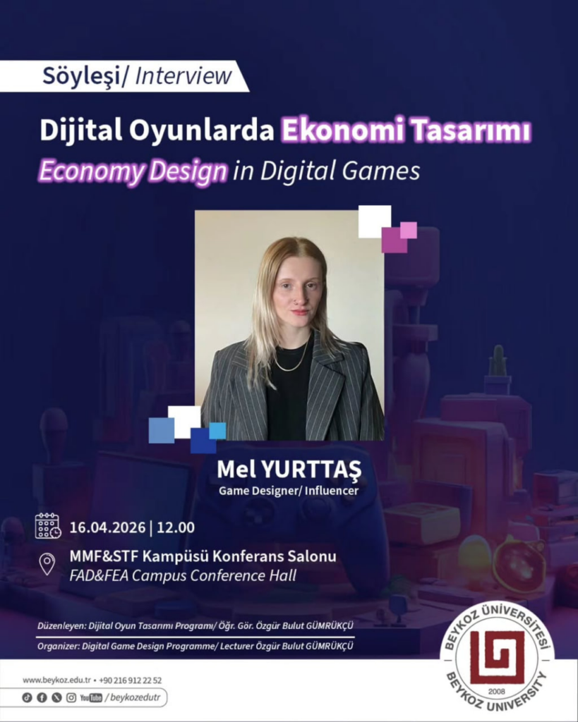 Oyun Tasarımının en önemli yapılarından biri olan ‘Game Economy’ konusunda Oyun Tasarımcısı Mel Yurttaş Beykoz Üniversitesi Dijital Oyun Tasarımı Bölümü’nden Öğr. Gör. Özgür Bulut Gümrükçü’nün Dijital Oyun Projesi 4 dersinin davetlisi oluyor.
