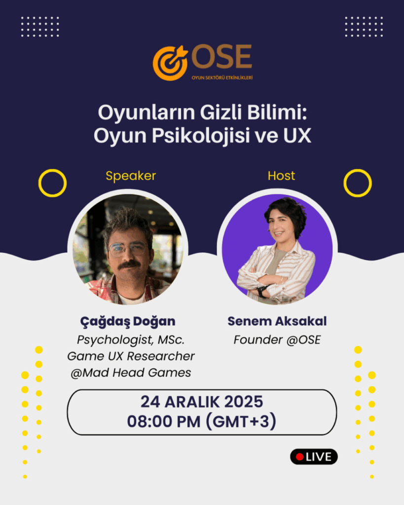 Psikoloji Bilimleri Master adayı olan ve Game UX Researcher olarak çalışan Çağdaş Doğan, OSE’ye konuk olarak “Oyun Psikolojisi ve UX”i detaylı olarak anlatıyor.