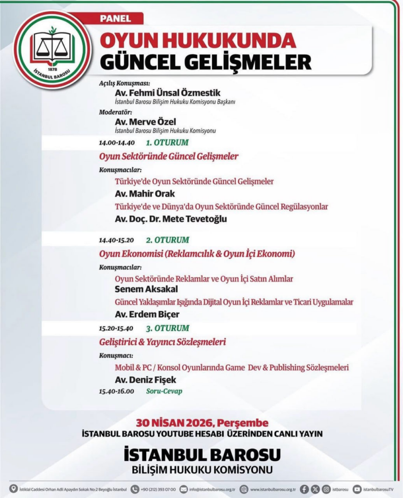 Oyun sektöründeki güncel hukuki gelişmeler; regülasyonlar, oyun ekonomisi, reklamcılık ve oyun içi satın alma süreçleri, ayrıca geliştirici-yayıncı sözleşmeleri alanında uzman isimler ile ele alınıyor.