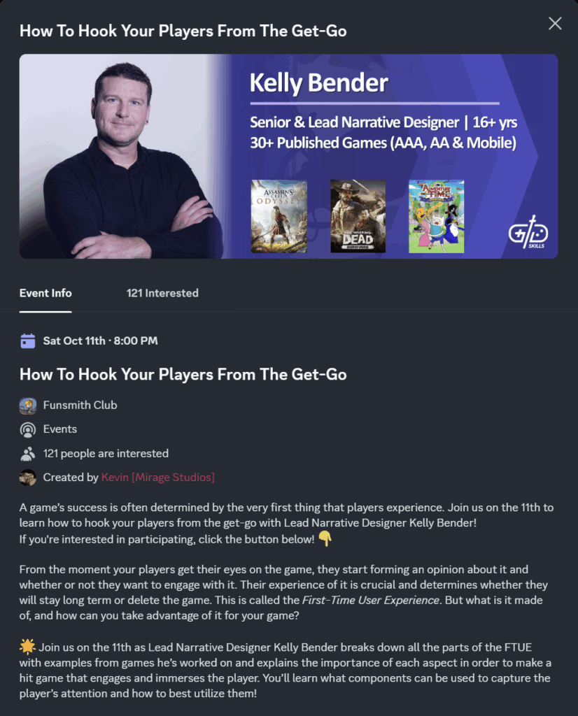 Funsmith Club Discord sunucusuna bu hafta, 16 yıllık deneyime sahip, Senior Narrative Designer olarak Assassin’s Creed Odyssey gibi projelerde çalışmış Kelly Bender konuk oluyor.