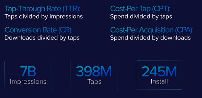 Raporda yedi milyar impression, 398 milyon tıklama ve 245 yükleme içerisinden TTR, CR, CPT ve CPA gibi dört önemli sonucun üzerinde duruluyor.