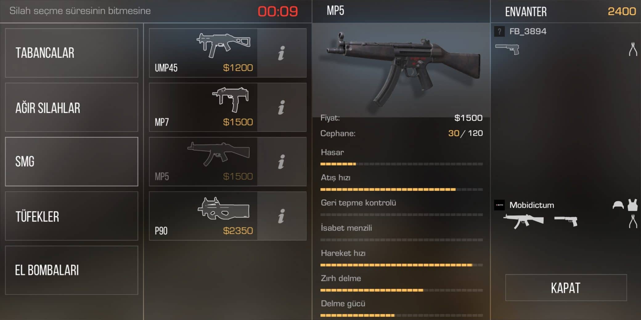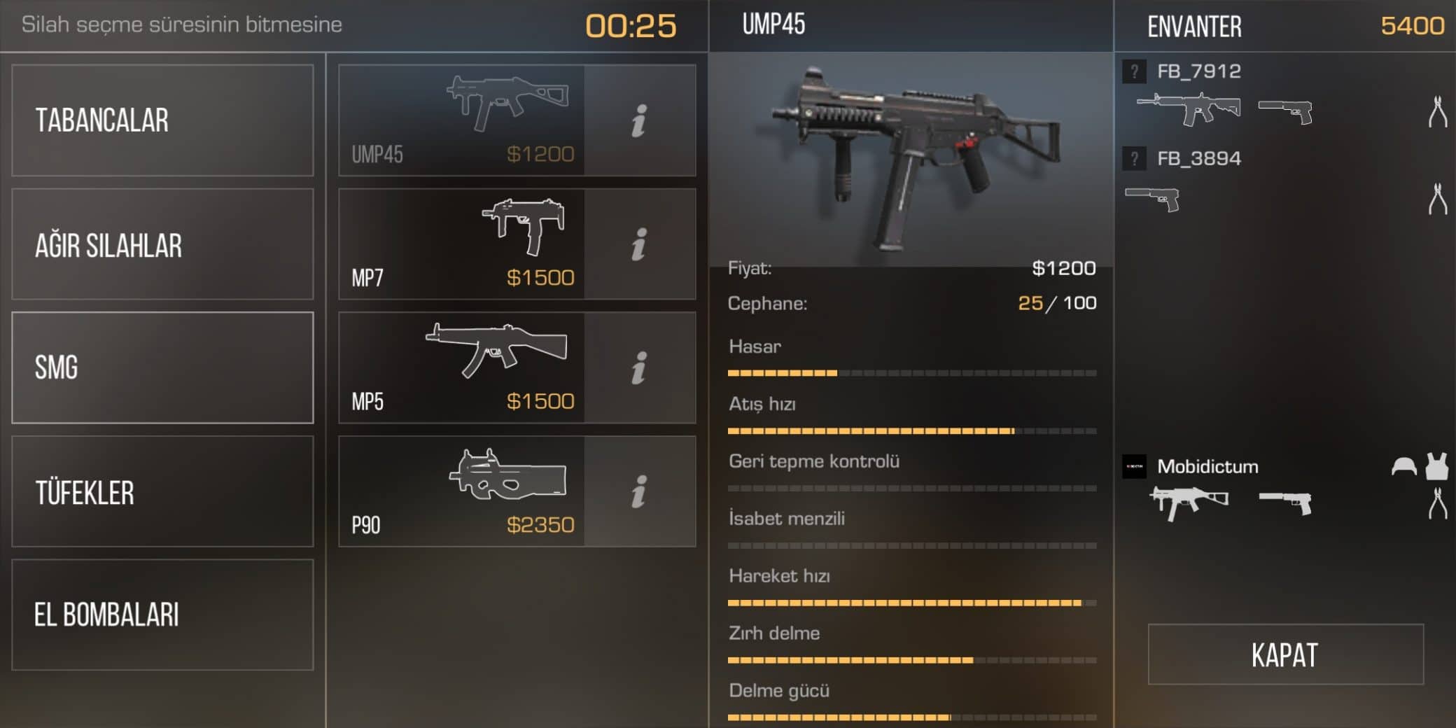 FPS oyunu oynayanların bildiği UMP45 silahını her iki takım da kullanabiliyor. Mağazadan 1200 dolarlık bir ücretle alabilirsiniz. Tek şarjörde 25 mermi bulunduruyor. Bu silah ile tek raunt içerisinde 125 mermi kullanabilirsiniz. Kontrolü oldukça basit olmasına rağmen hasarı yüksek bir silah. Eğer daha iyi bir silah almak için paranız yetersizse bu silah tam size göre. UMP45’le aldığınız her öldürme başına 400 dolar kazanacaksınız.